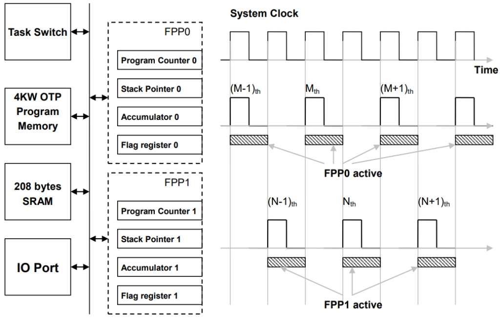 Going back to the Padauk’s FPPA feature, each FPP is just a bag of CPU registers — program counter, stack pointer, accumulator, and CPU flag register — that represent the context of the CPU. The CPU takes turns executing each context for one clock cycle before switching to the next.