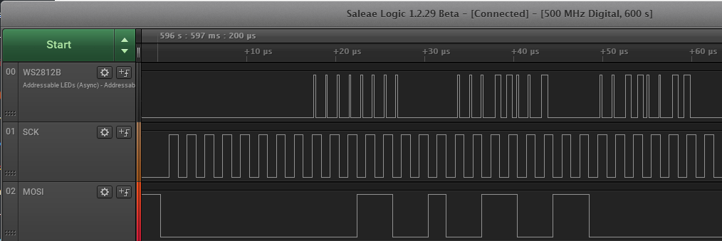 The firmware takes a 480 – 510 kHz SPI signal (data and clock only) and outputs it as a WS2812B-compatible pulse train. There is a one-byte (16 µs) latency, which should be fine for most applications.